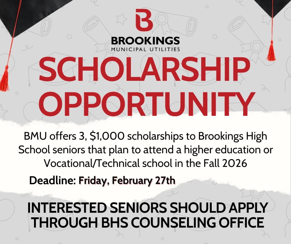 BMU is proud to offer three $1000 scholarships to be awarded to three Brookings High School Seniors. Seniors that plan to attend a higher education or Vocational/Technical school in the Fall 2026 are encouraged to apply. Deadline is February 27, 2025. To apply visit BHS Local Scholarship Application 2026 - Fillable.pdf - Google Drive or talk with a BHS counselor.